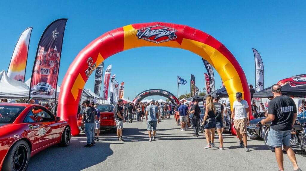 L'impact visuel d'une arche gonflable dépasse largement celui des supports publicitaires traditionnels. Sa taille imposante et sa position stratégique en font un repère immédiat pour tous les visiteurs. Dans le cadre d'un événement automobile, qu'il s'agisse d'une exposition de véhicules ou d'une manifestation commerciale, l'arche crée instantanément une atmosphère festive et professionnelle. Elle matérialise l'entrée principale, délimite les espaces et contribue à structurer le parcours des visiteurs. Cette fonction d'orientation est particulièrement précieuse lors de grands rassemblements où la clarté de la signalétique influence directement la satisfaction du public.